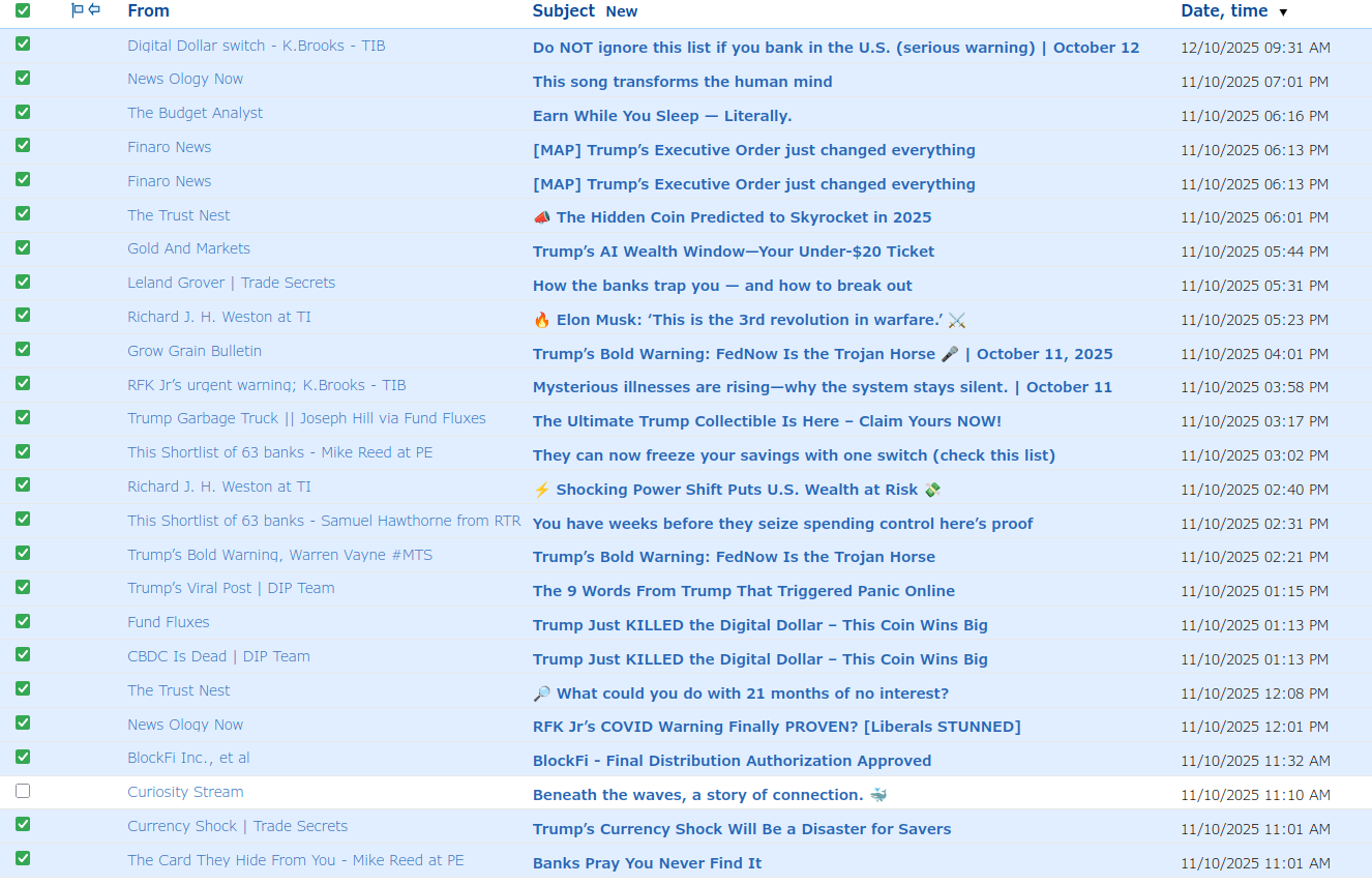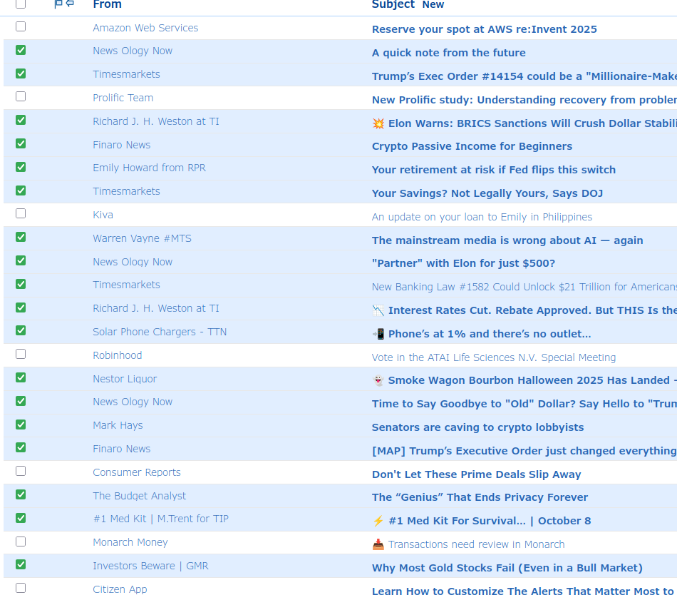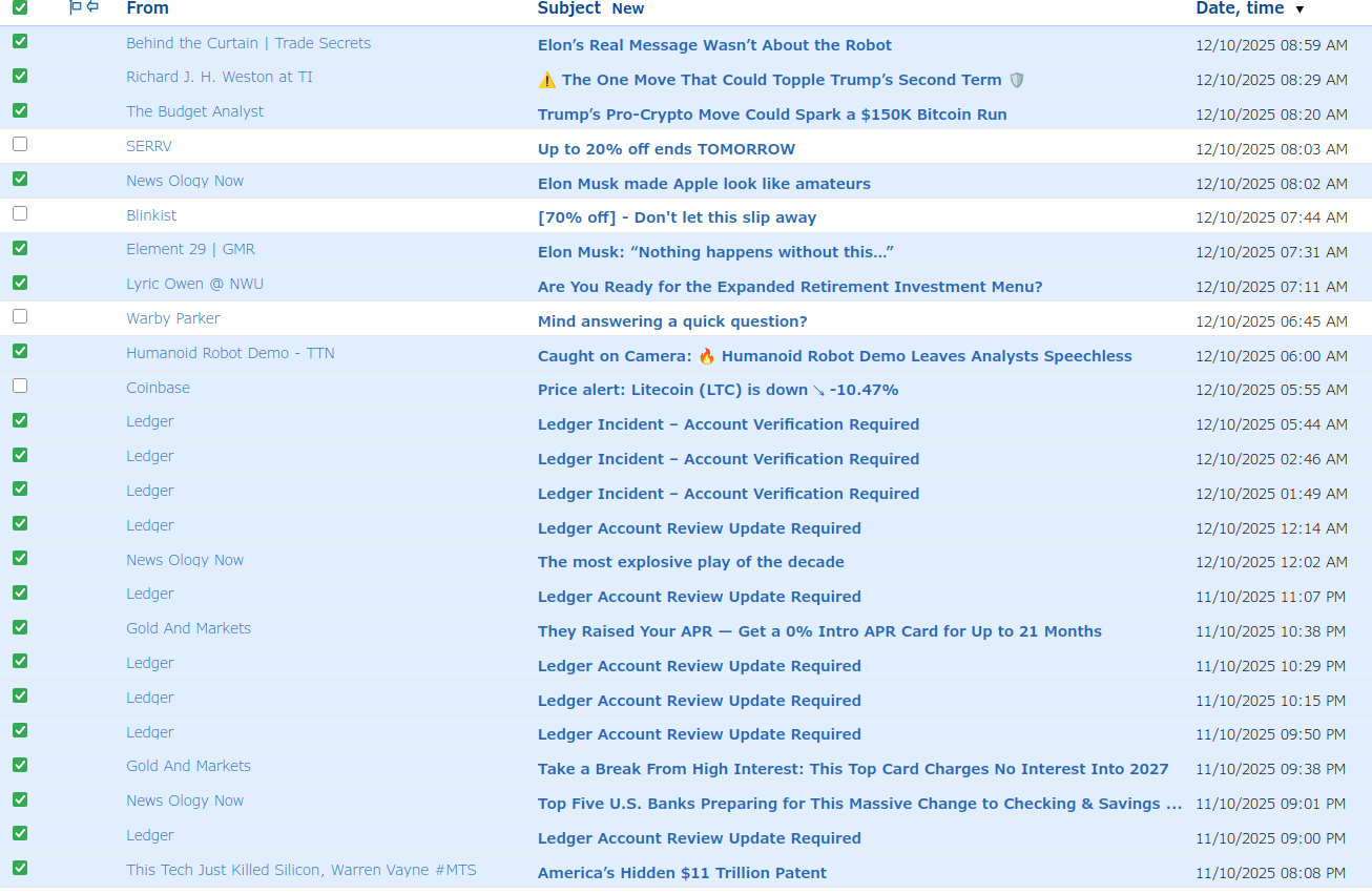 So, as a test, for a few weeks, I disabled all of my custom filters for battling spam. These screenshots show the result of that (note, the checkmarked/highlighted emails are actual spam, while others are legitimate):